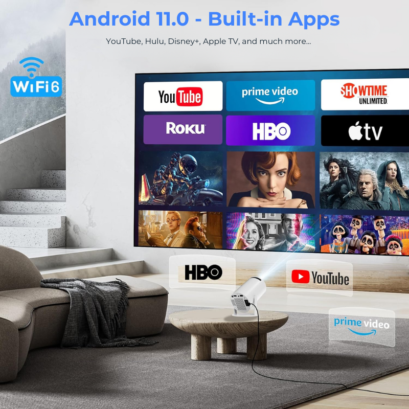 Noshio offers versatile connectivity including Wi-Fi (dual frequency 2.4G & 5G), Bluetooth 5.0, HDMI, USB, and AUX ports. It supports screen mirroring via Airplay and Miracast, making it compatible with smartphones, tablets, laptops, gaming consoles, and more. You can easily pair devices wirelessly or connect directly with cables.